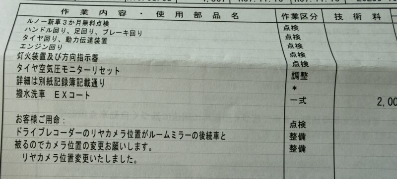 キャプチャーの納車(2025年8月8日)から早いもので3ヶ月が経ち、初回点検を行ってきました。