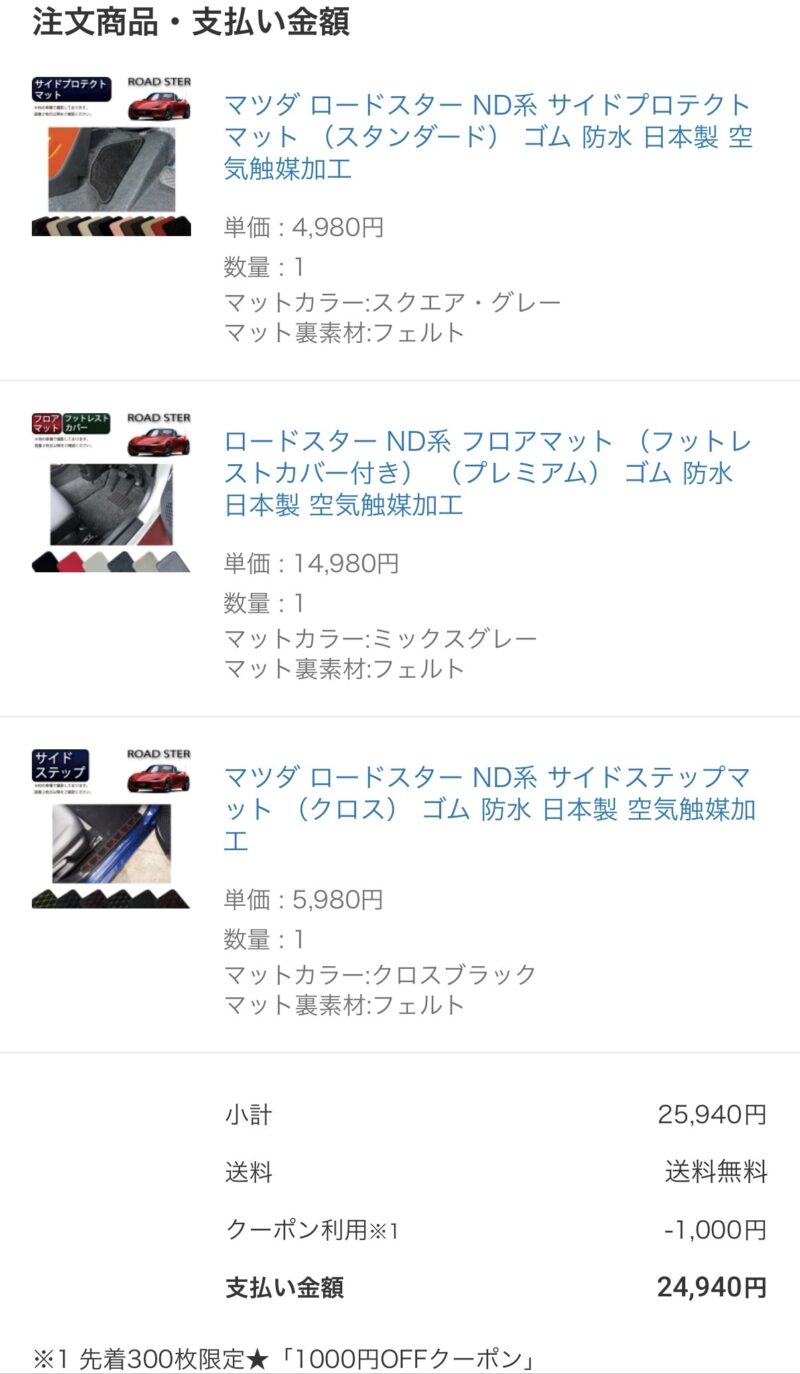 今回はフロアマット+サイドプロテクトマット+サイドステップマットの計3点で25,940円(楽天のクーポン1,000円もあり、24,940円)で揃えることができました。